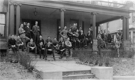 A formal petition for a charter was assembled, dated April 1, 1917, and in it were included letters of recommendation from U.W. President Charles Van Hise, and Harold Browning, who suggested that “the expansion of Theta Chi in the future should be directed mainly to the great institutions of the Middle West.” At this time the only chapter in the Midwest was Rho at the University of Illinois. A letter from Dean Goodnight, who had known the group since its organization in 1915, praised its “clean, young fellows” for their “unusually high ideals,” “extreme conservatism,” and the group’s “democratic atmosphere,” with no trace of “snobbishness or haughtiness among them.” He noted the group’s academic successes, and concluded that he was “convinced that they will maintain a chapter at this institution of which the national organization will always have reason to be proud.” The names of the 29 members and five pledges were affixed, and copies of the petition were sent to the Grand Chapter to be circulated among the existing chapters. April 1917 saw many events that would soon come to affect the Greek system in general and Alpha Sigma Tau in particular. The United States formally entered World War I on April 6. On April 7, a Theta Chi National Convention officially prohibited alcoholic beverages in and about all chapter houses and chapter functions. And on April 3, Madison residents voted themselves a dry city as of that July. Fortunately, no members of Alpha Sigma Tau, or later Psi Chapter, were lost in the war, although almost all were either conscripted or volunteered.6 The lease on the chapter house expired at the close of the 1916-17 school year, and the house committee appointed to secure a residence for the coming year bumped into a big stumbling block. Due to the war, prospects for a large membership next semester looked rather slim. By August, however, it was found that about 75 percent of the members would return, and so a three-story house at 148 W. Gilman St. was leased and ready for occupancy at the opening of the school year in September.