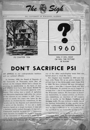 During the 1950s, Psi Chapter once again faced grim prospects, although this time through no fault of its own. The University of Wisconsin, which still administered the Greek system, decreed in 1952 that all U.W. fraternities and sororities must admit members regardless of their race by 1960 or face expulsion from the Greek system. Psi Chapter was in a quandary; its admission practices had always been liberal, and the chapter roll as far back as the 1920s included Jewish, Latino, and foreign-born members, who would have been prohibited by many other houses. Yet the Theta Chi national constitution limited membership to whites only.13 So it became Psi Chapter’s mission to open Theta Chi Fraternity to men of all races. After sending delegations to several other chapters promoting this idea, the campaign ended in 1957 when by active chapter mail vote, the whites-only clause was repealed from the national constitution.